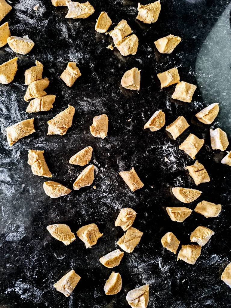 Shape the dough into a ball, divide it in two, and roll each half into a long rope (like a worm 🐛). Cut into small gnocchi-sized pieces using a knife.