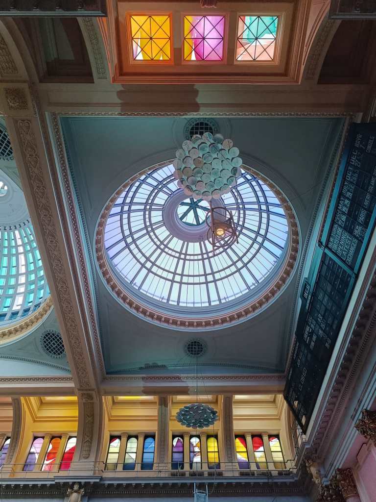 Afterwards, we popped into the Royal Exchange Theatre, formerly the boardroom of the historic Cotton Exchange. The space still features the original cotton exchange board, which once displayed global market figures, and its preserved floor gives you a real sense of Manchester’s industrial past. It’s a beautiful, atmospheric spot that’s well worth a visit. 🧵✨