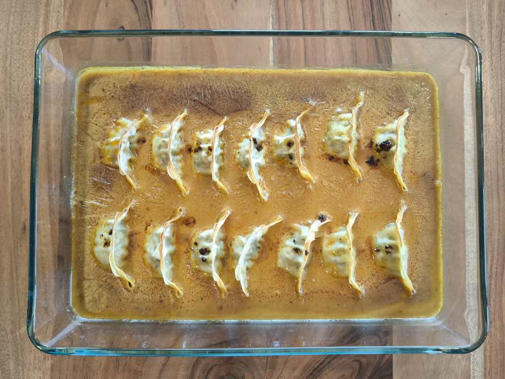 Place the tray in a preheated oven at 200°C (fan) and bake for 15 minutes. The dumplings will steam through, and the sauce will bubble and thicken slightly.