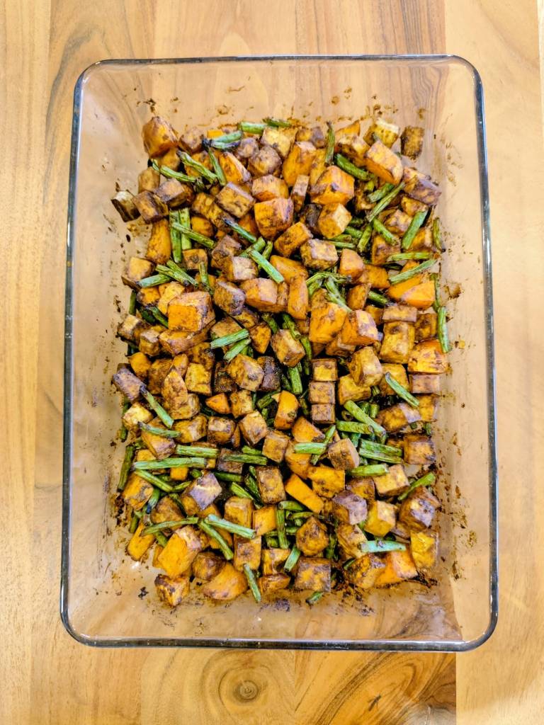 - Cut the sweet potatoes and tofu into bite-sized cubes